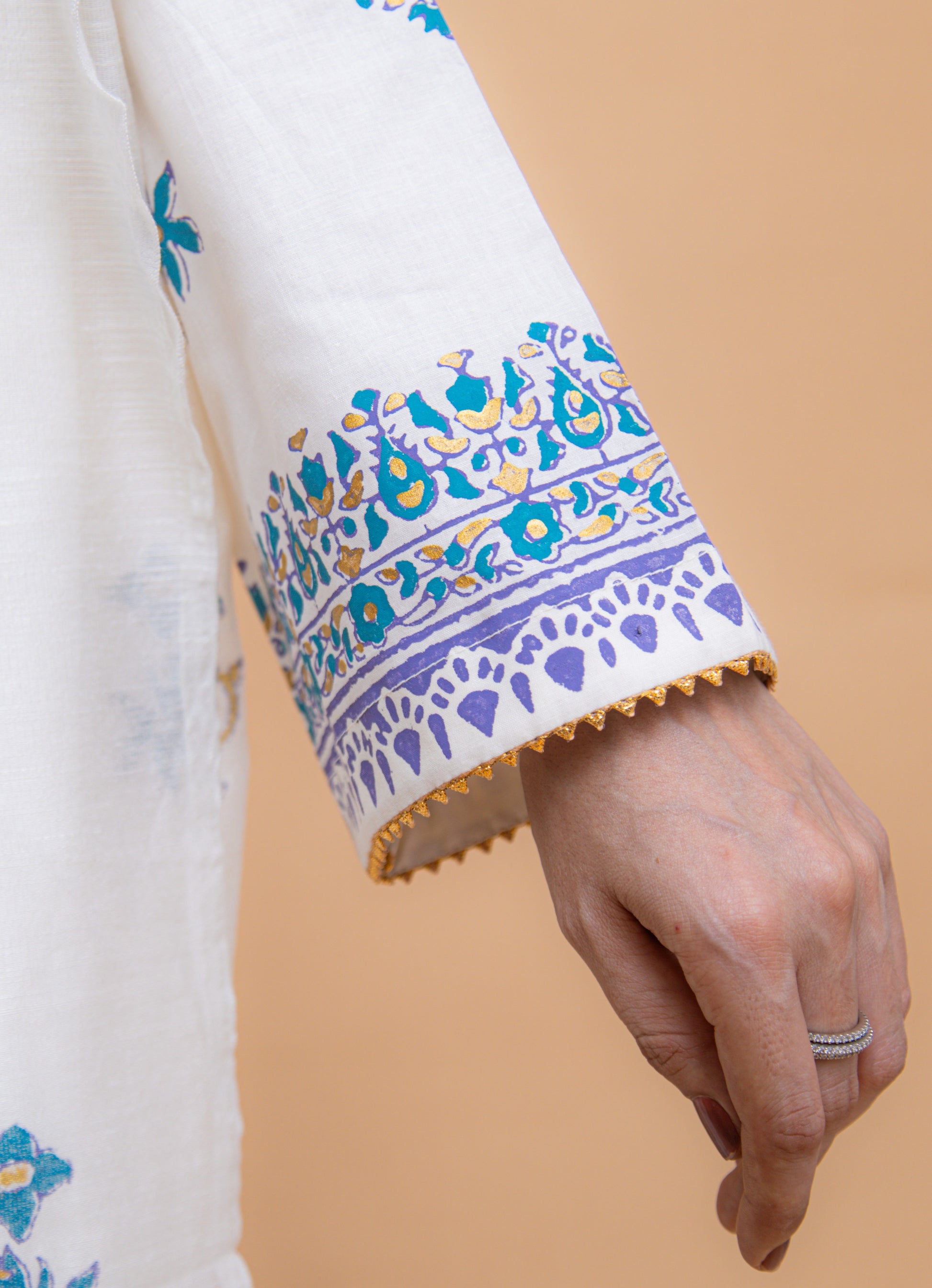 Breezy, graceful, and effortlessly chic, Aira is an off-white lawn dress adorned with delicate gold, purple, and sea green block prints, creating a balanced look that’s both lively and subtle. Lightweight and breathable, it’s the perfect everyday outfit for warm days—easy to style, easy to wear, and always elegant.