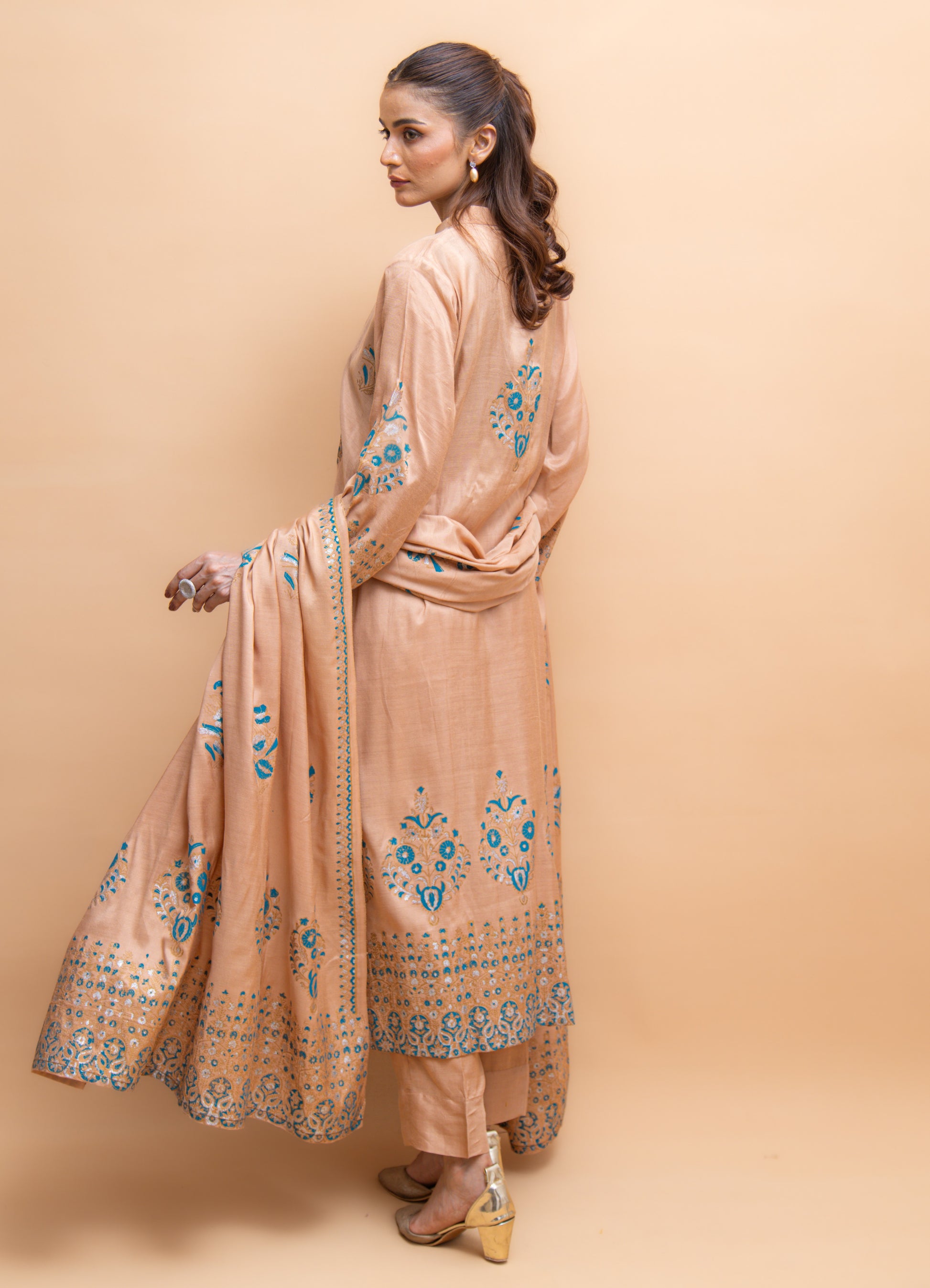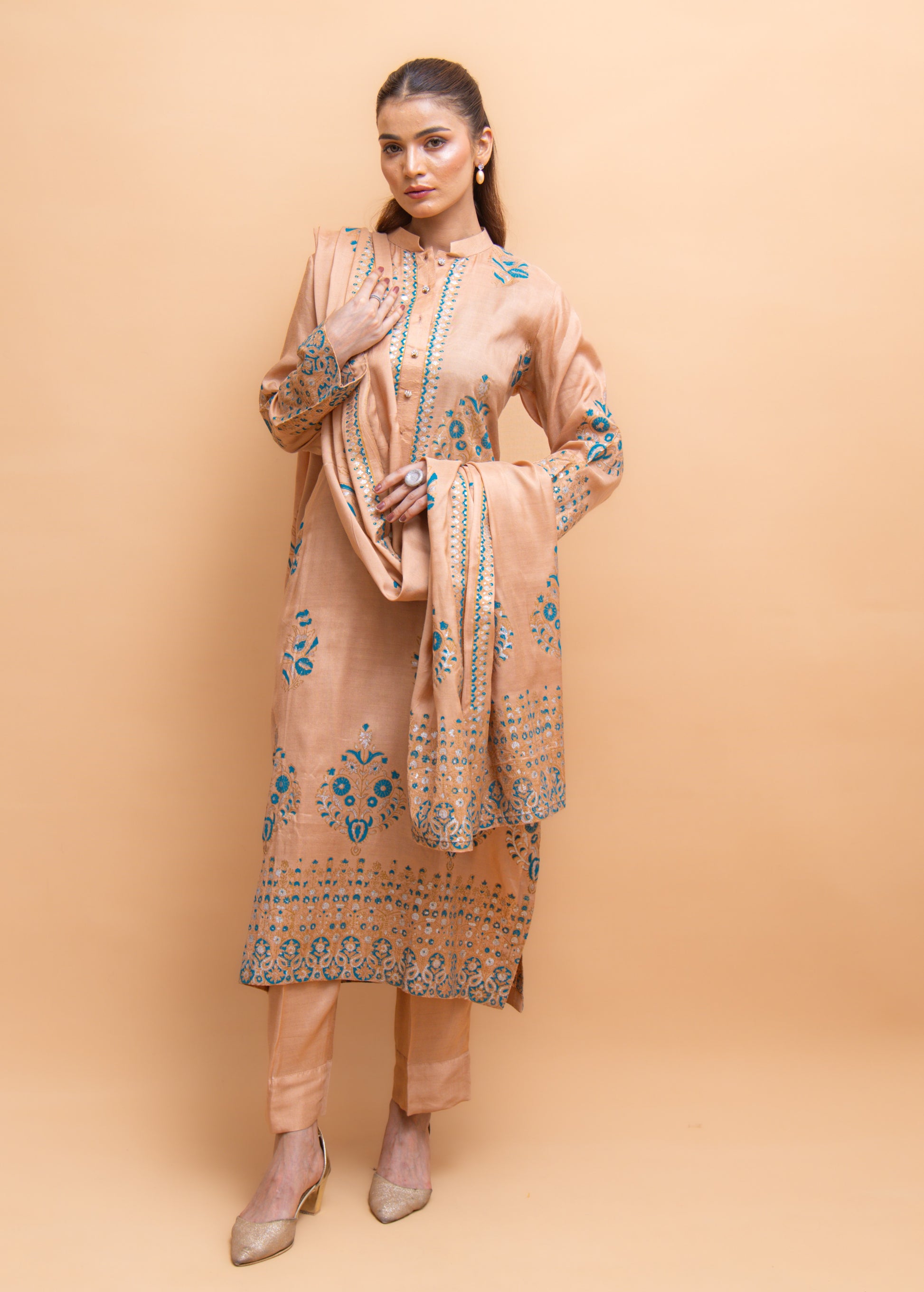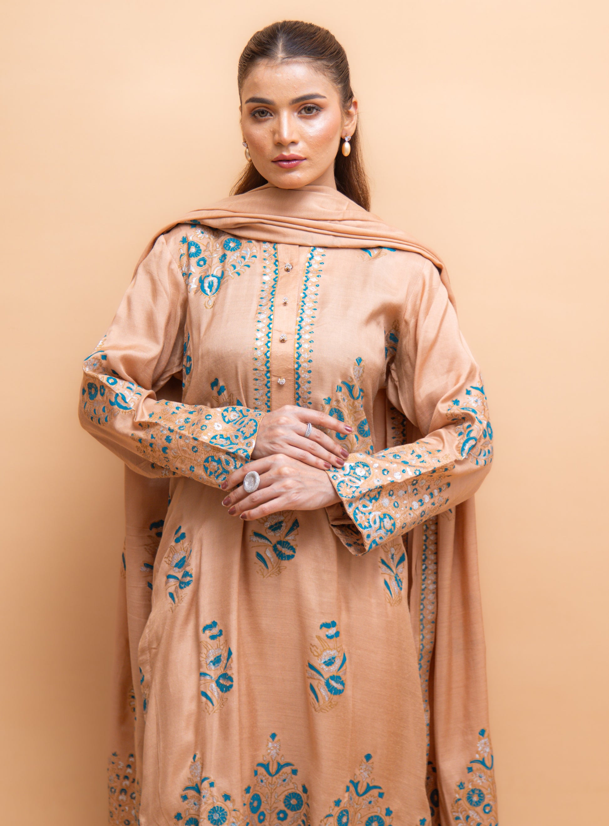 This beige silk 3 piece dress radiates elegance with its delicate sheen and graceful design. Adorned with beautiful ferozi (turquoise) and silver block print detailing, the dress combines softness with a pop of vibrant color and subtle metallic accents.