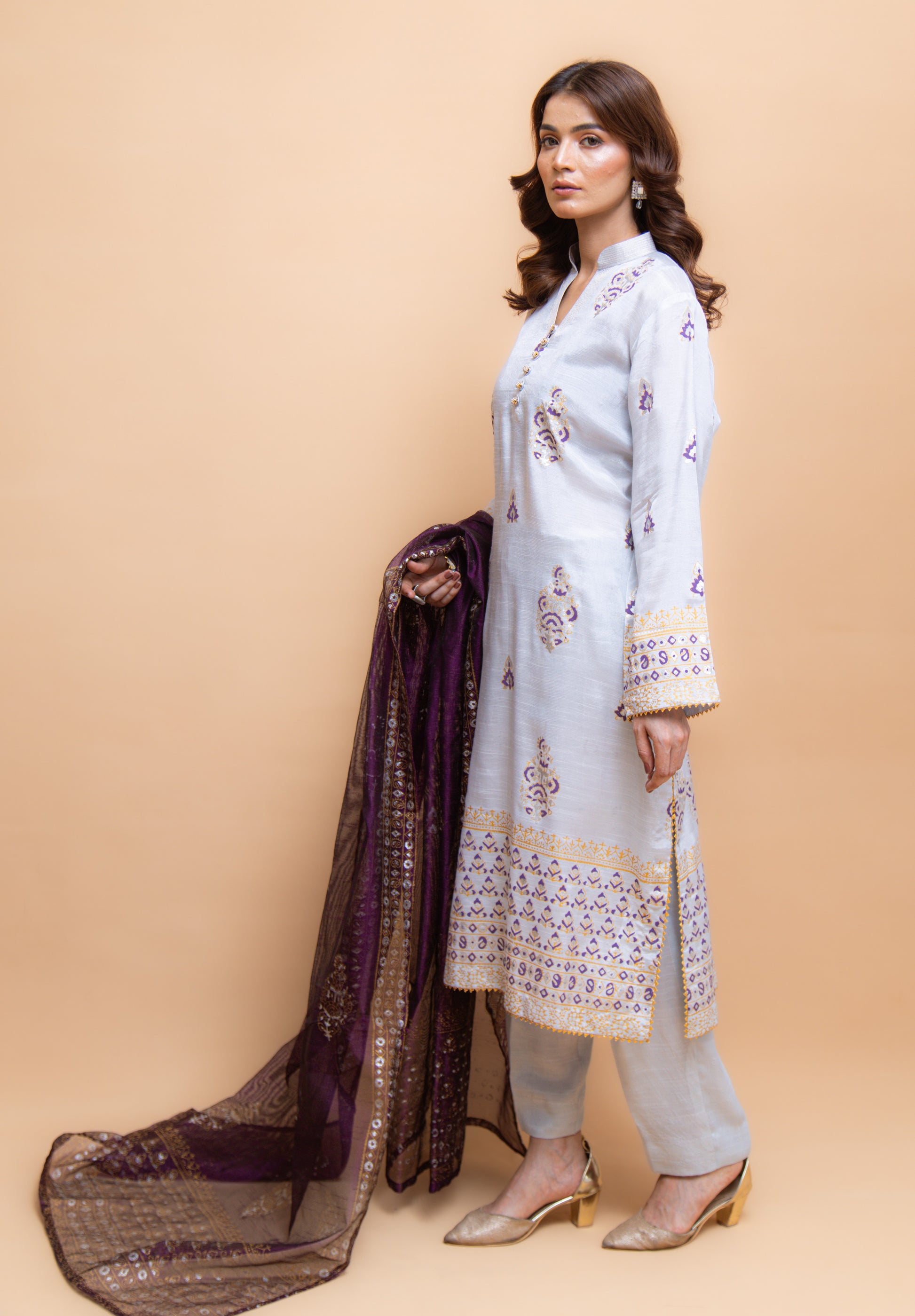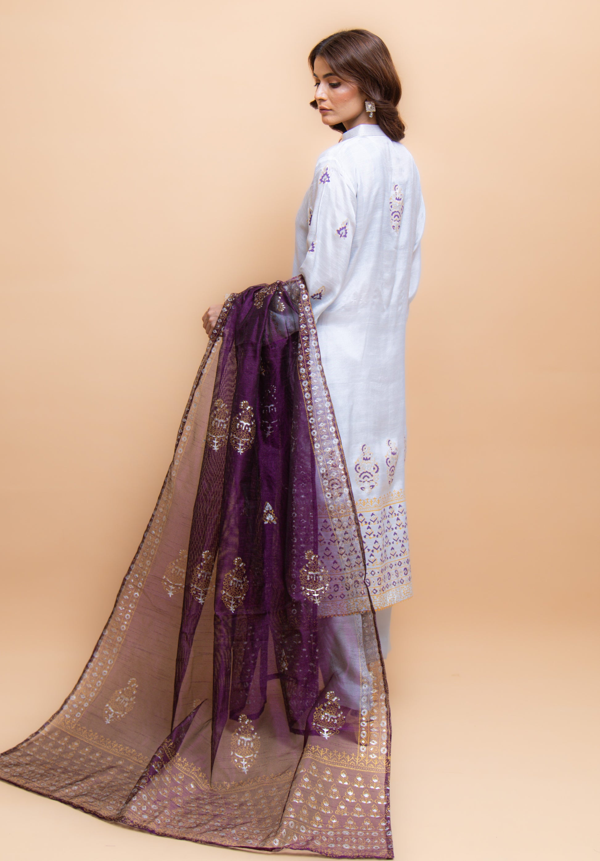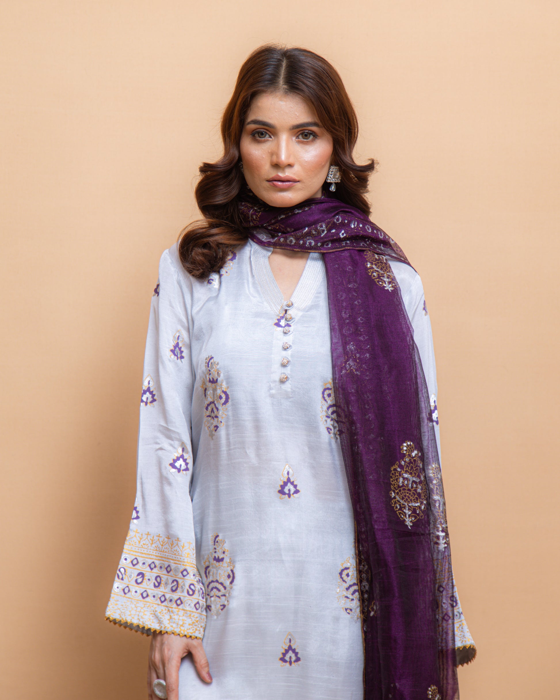 The soft, shimmering silver dress with subtle detailing, paired with a rich purple cotton net dupatta, delicately adorned with hints of gold and silver. Ideal for evening and festive celebrations.